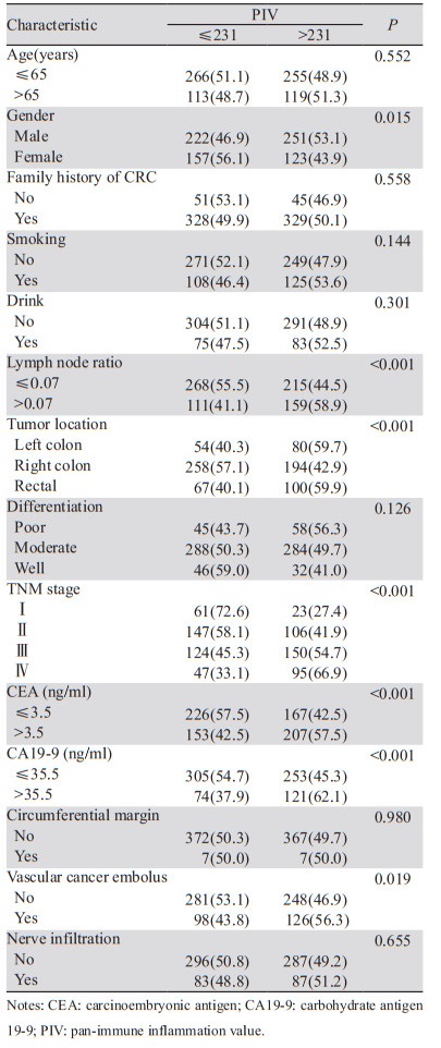 新发现的一种免疫炎性反应生物标志物——泛免疫炎症值(pan-immune-inflammation value, PIV),它主要由中性粒细胞计数、血小板计数、单核细胞计数和淋巴细胞计数得出,由于PIV具有全面揭示全身免疫和癌症相关炎性反应状态的潜在能力,PIV被视为晚期癌症患者临床结果的可靠预测指标。因此,基于我们目前对PIV的相关认知及研究,本研究拟探索结直肠癌患者生存结局更有价值的预后标志物,并建立结直肠癌患者的预后模型。