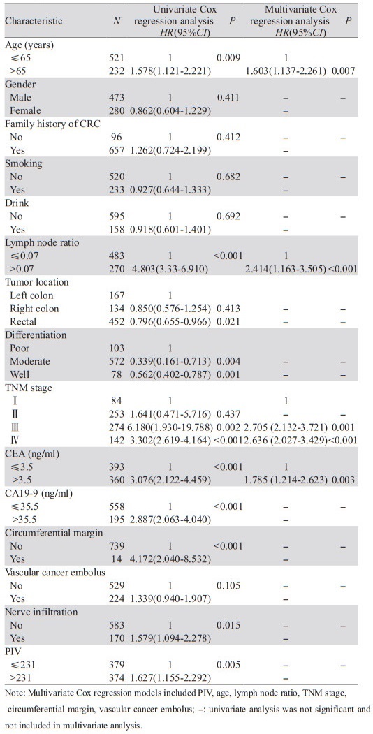 1 资料与方法 1.1 研究人群本研究共纳入2013年1月—2016年12月在湖北省肿瘤医院接受原发病灶切除术的753例经组织病理学证实的结直肠癌患者。主要分析患者的年龄、性别、结直肠癌家族史、吸烟和饮酒史、TNM分期、肿瘤分化程度、部位、神经浸润、环周切缘和脉管内瘤栓等指标。所有患者均在术前一周检测了血小板、中性粒细胞、单核细胞、淋巴细胞、CEA和CA19-9水平。纳入标准:(1)年龄≥18岁;(2)原发性结直肠癌患者;(3)接受根治性手术的患者。排除标准:(1)合并其他癌症;(2)临床数据缺失的患者。本研究得到了湖北省肿瘤医院伦理委员会和机构审查委员会的批准。此外,所有患者均签署知情同意书。