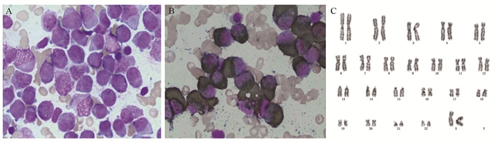 A: Cellular morphology (HE ×100); B: POX staining (×100); C: Chromosoma. 图 1 患者细胞形态和遗传学检测结果 Figure 1 Cell morphology and chromosoma testing results |