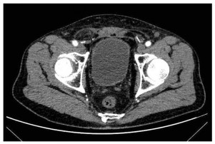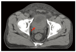 | 图 1 患者治疗前CT扫描显示膀胱弥漫性增厚 Figure 1 Pretreatment CT scan showed diffuse bladder thickening |