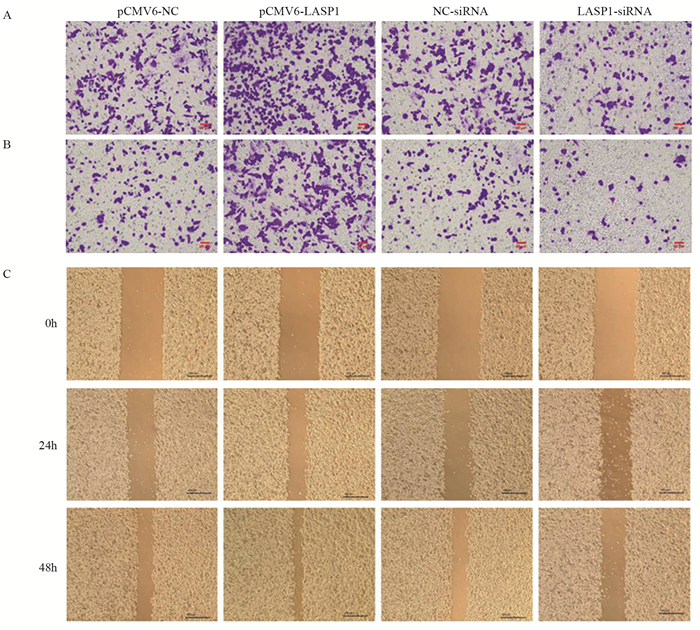 Transwell和划痕实验结果显示,与pCMV6-NC组相比,pCMV6-LASP1组细胞的迁移以及侵袭数量显著上升(分别P=0.003、P=0.000),24和48 h伤口愈合率均显著升高(分别P=0.004、P=0.009);与NC-siRNA组比较,LASP1-siRNA组细胞的迁移以及侵袭数量显著下降(分别P=0.002、P=0.001)、24 h和48 h伤口愈合率均显著降低(P=0.006、P=0.004),见图 1。