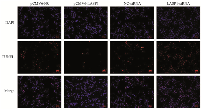 Tunel染色结果显示,与pCMV6-NC组相比,pCMV6-LASP1组细胞凋亡率显著降低(P=0.003);与NC-siRNA组比较,LASP1-siRNA组细胞凋亡率显著升高(P=0.000),见图 2。