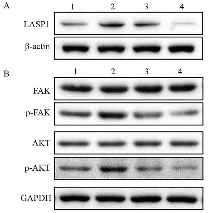 | 1: pCMV6-NC; 2: pCMV6-LASP1; 3: NC-siRNA; 4: LASP1-siRNA; A: Western blot result of LASP1 protein expression; B: Western blot result of p-FAK/FAK and p-AKT/AKT protein expression. 图 3 LASP1过表达或沉默对LOVO细胞相关蛋白表达的影响 Figure 3 Effects of LASP1 overexpression or silence on related protein expression in LOVO cells |