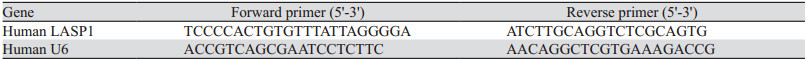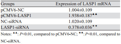1.4 qRT-PCR检测LASP1基因表达提取各组细胞RNA,反转录PCR进行DNA扩增,实时荧光定量PCR检测LASP1表达。反应条件为变性95℃ 10 min,扩增反应,95℃ 15 s,60℃ 60 s,40次,溶解曲线,95℃ 15 s,60℃ 60 s,95℃ 15 s。采用2-△△CT法对结果进行相对定量分析。引物序列见表 1。