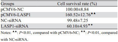 MTT实验结果显示,与pCMV6-NC组相比,pCMV6-LASP1组的细胞存活率显著上升(P=0.000),与NC-siRNA组比较,LASP1-siRNA组的细胞存活率显著下降(P=0.000),见表 3。