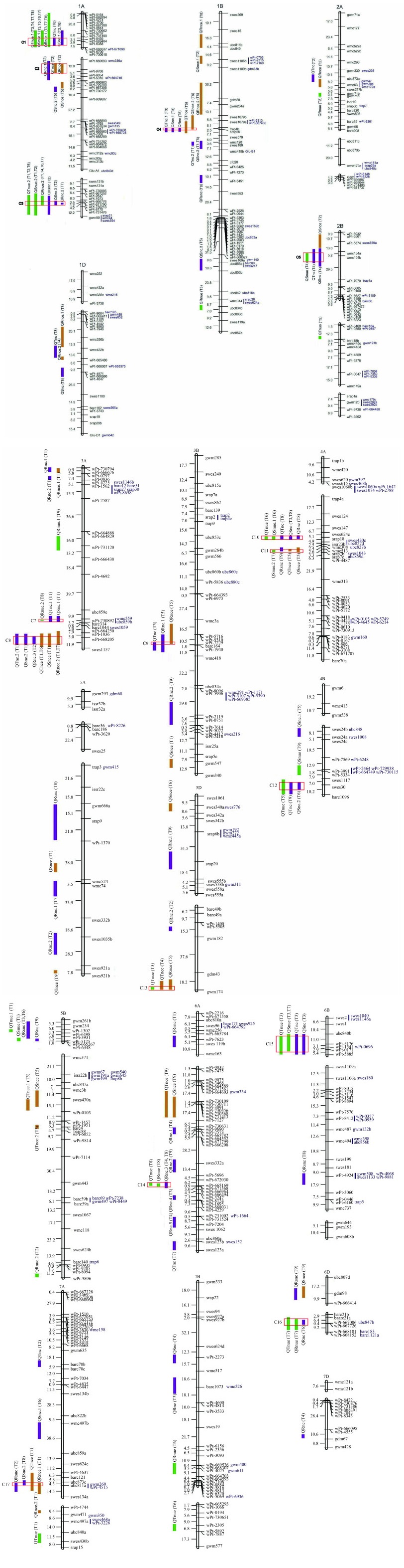 | 图1 小麦苗期QTL位点在遗传图谱上的位置 Fig. 1 Locations of QTLs for wheat seedling traits under different P and K treatments |