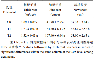 | 表1 不同处理苹果根系生物量和新梢长度 Table 1 Biomass of roots and length of new branches of apple trees under different treatments |
