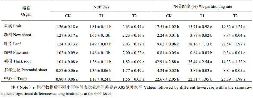 Ndff(%) 指植株器官从肥料中吸收分配到的15N量对该器官全氮量的贡献率,反映了植株器官对肥料15N的吸收征调能力。由表2可知,果实成熟期,不同处理之间各器官的Ndff值表现一致,均为果实 > 新梢 > 叶片 > 细根 > 粗根 > 多年生枝 > 中心干。各器官的Ndff值均以T2处理最大,其次为T1处理,CK处理最低。各器官中 15N占全株15N总量的百分率反映了肥料氮在树体内的分配及在各器官中的迁移规律[16]。在果实成熟期,T2处理的叶片、果实和一年生枝的15N分配率显著高于CK和T1处理。