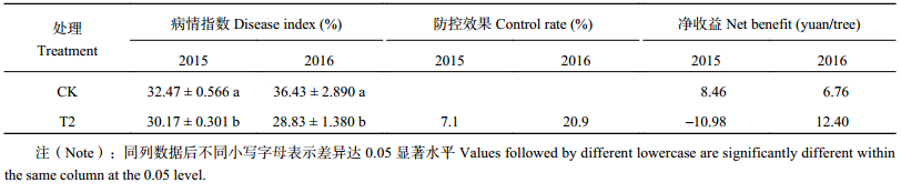 由表4可知,CK处理果实花脸病发病严重,2015年和2016年果实花脸病情指数分别达到了32.5%和36.4%;而T2处理2015年和2016年果实的病情指数分别为30.2%和28.8%。可见,施用微生物菌肥一年后,防控效果仅为7.1%,但由于是分级统计果实花脸病的方法,在果实表观上表现并不明显,而连续施用微生物菌肥两年后,防控效果达到了20.9%,效果显著。T1处理无花脸病情,病情指数为0。比较2个处理的净收益可以看出,CK处理净收益逐年递减,而T2处理的净收益逐年增高。