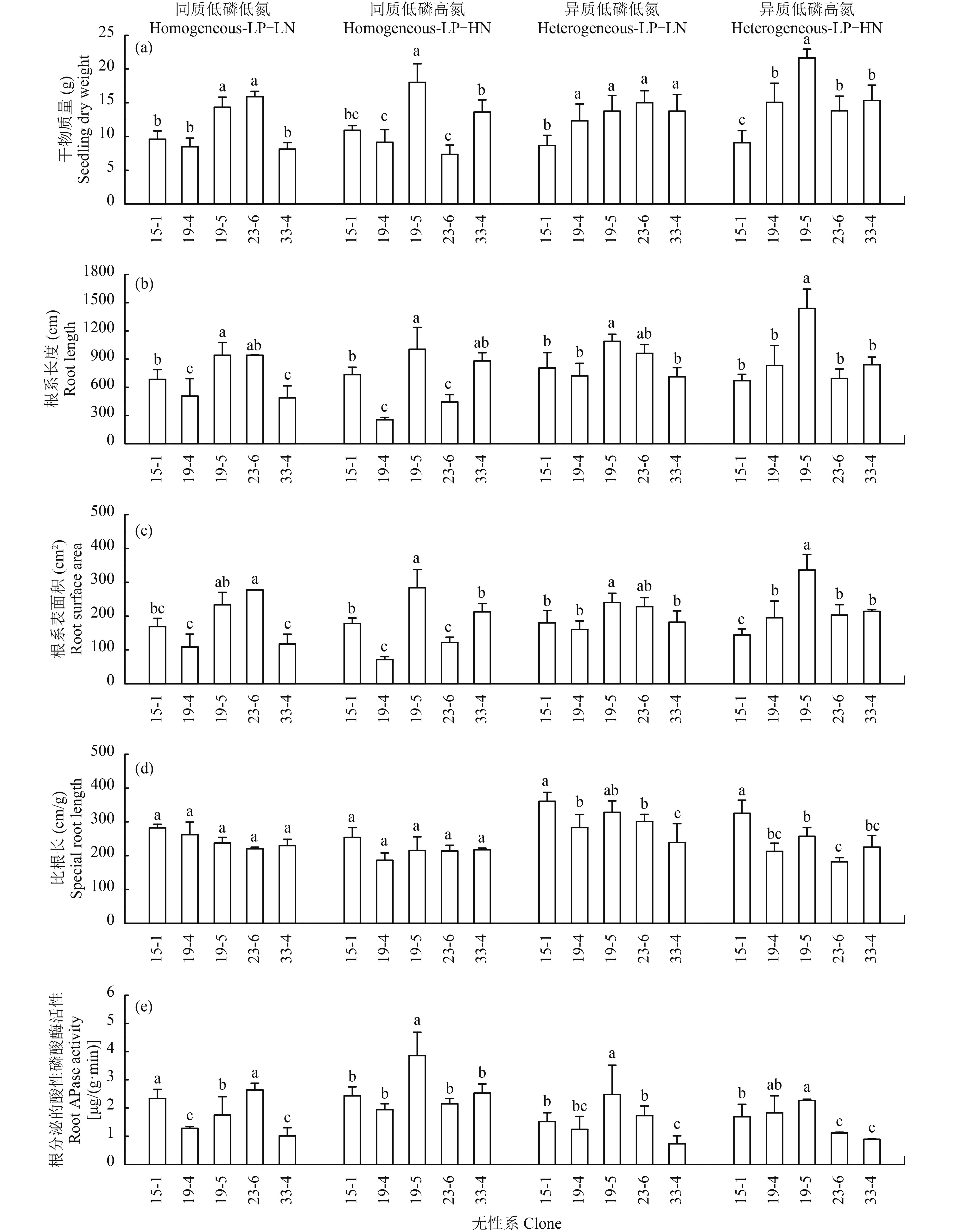 2 结果与分析 2.1 模拟氮沉降对低磷胁迫下马尾松无性系苗木生长的影响方差分析结果显示,在两种低磷环境下,5 个马尾松无性系的苗高和干物质积累量的遗传差异均达到显著或极显著水平 (表 1),在同质低磷下,苗高和干物质积累量的变幅分别为 47.15~57.56 cm 和 8.82~16.18 g,最大无性系分别较最小无性系高出 22.08% 和 83.45%;异质低磷下的变幅则分别为 37.51~58.39 cm 和 8.87~17.70 g,最大无性系分别是最小无性系的 1.56 倍和 1.99 倍。马尾松无性系的苗高和干物质积累量在同质低磷下的氮素效应不显著,但存在明显的无性系 × 氮交互效应;相反,在异质低磷下的氮素效应显著,而无性系 × 氮的交互效应不显著 (表 1)。不同马尾松无性系的苗高、干物质积累量对模拟氮沉降的响应有所差异。无性系 23-6 的苗高和干物质积累量在两种低磷环境下均随氮素浓度的增加而减小,其他无性系则表现出相反的变化趋势,其中,在同质低磷下,干物质积累量增加幅度排名前两位的分别为无性系 33-4 (67.65%) 和 19-5 (25.82%),而在异质低磷下,增幅排名前两位的无性系分别为 19-5 (57.38%) 和 19-4 (22.04%)(图 1a),苗高也表现出类似的变化规律,即参试的 5 个马尾松无性系中,19-5 无论在同质低磷还是异质低磷下均表现出对模拟氮沉降的正响应,氮沉降下干物质生产能力均显著增加,而 23-6 在两种磷素环境下的苗高、干物质积累量均受到氮沉降的抑制效应。