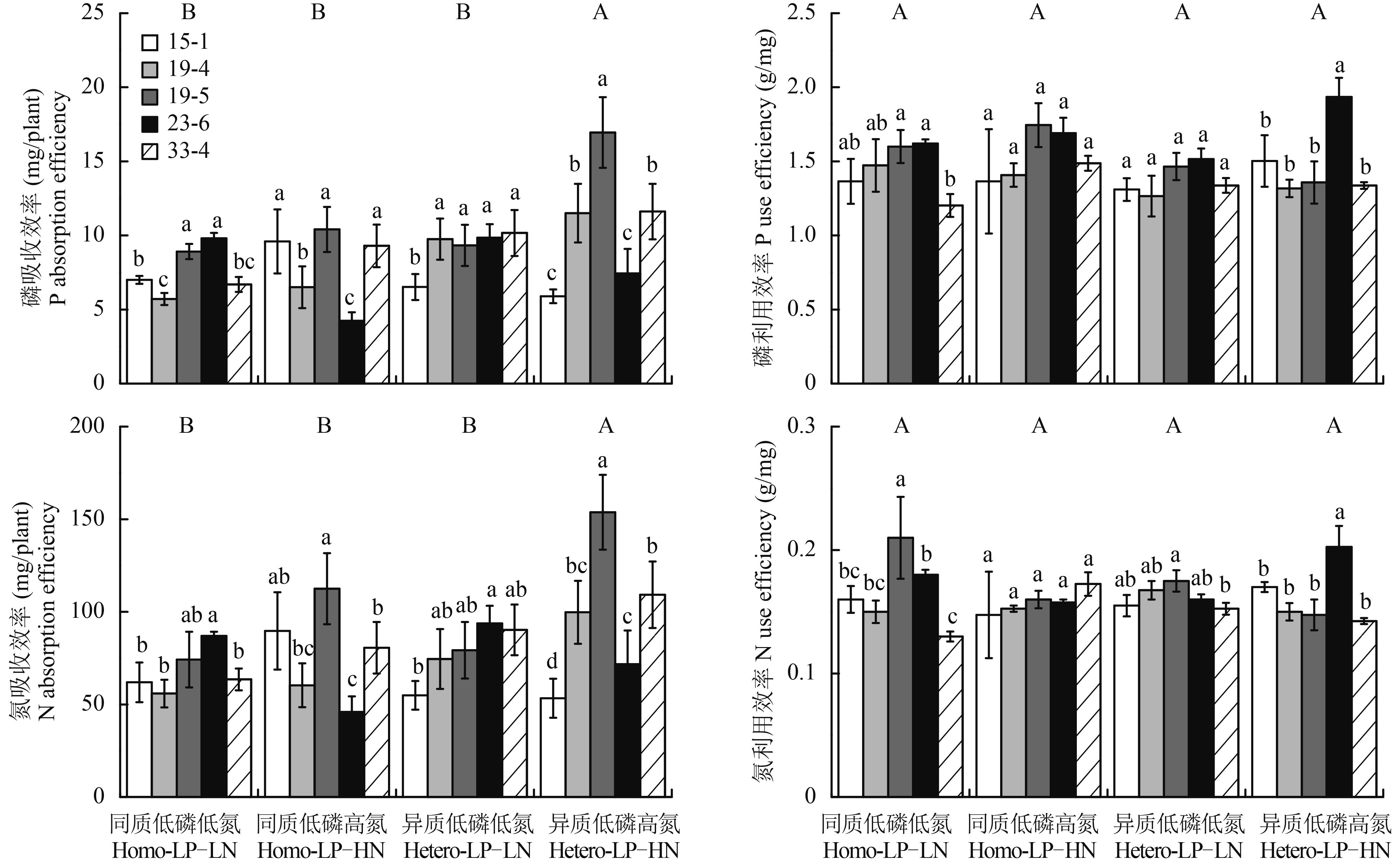 2.3 模拟氮沉降对低磷胁迫下马尾松无性系苗木磷效率的影响在两种磷素环境下,模拟氮沉降对马尾松无性系磷吸收效率的影响,整体表现为促进作用,但不同无性系反应差异较大;磷利用效率受模拟氮沉降影响较小 (表 1、图 2)。同质低磷下,苗高、干物质积累量在高氮下明显增加的无性系 33-4 和 19-5,其整株磷吸收效率也显著增大,分别较低氮增长了 38.92% (33-4) 和 16.78% (19-5)(图 2);在高氮下干物质积累量显著下降的无性系 23-6,其磷吸收效率在高氮水平下为 4.24 mg/plant,较低氮显著下降了 56.72%,显著低于同水平下其他无性系的磷吸收效率。异质低磷下,仅高氮下磷吸收效率最高、干物质积累量最大的无性系 19-5,其整株磷吸收效率的增幅显著高于其他无性系,如在高氮下的磷吸收效率为 16.95 mg/plant,约是其他无性系的 1.26 倍 (图 2);干物质积累量在高氮下降低的无性系 23-6,其磷利用效率反而显著高于其他无性系,但磷吸收效率与其他无性系相比无显著优势。这表明,与磷利用效率相比,磷吸收效率对无性系的生长和干物质积累量的促进作用更为明显。