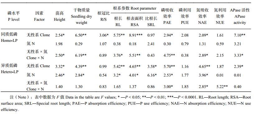 4 结论1) 在两种低磷环境下,马尾松无性系的磷效率指标在无性系间变异显著,不同无性系对氮沉降的响应存在差异,因此,在大气氮沉降背景下选育磷高效优良无性系具有较大的潜力和可行性。