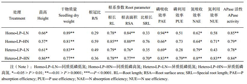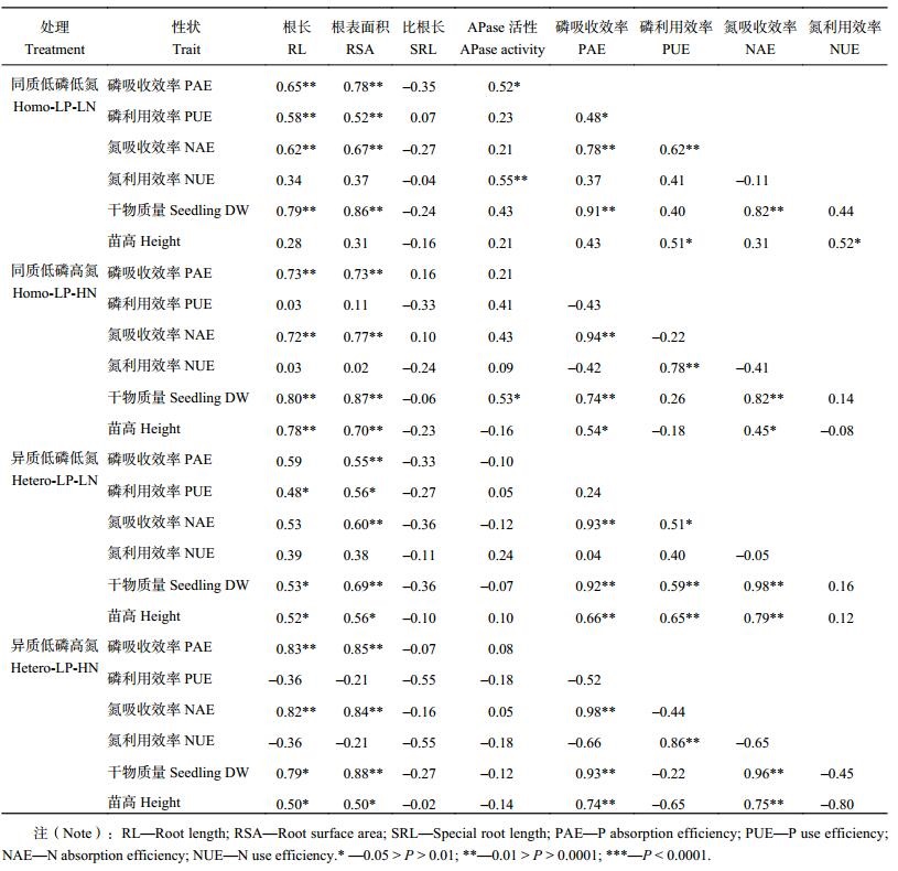 2.4 不同氮、磷条件下马尾松无性系苗木生长、根系发育及磷效率的重复力和性状相关性2.4.1 重复力 重复力表示为基因型方差与一般环境方差之和在表型方差中所占的比例,体现的是遗传因素对植物生长影响的强弱。由表 2可知,在不同氮、磷处理下,马尾松无性系苗高、干物质积累量、根系长度、根系表面积、磷吸收效率以及根分泌的 APase 活性的重复力绝对值均较高,且达到显著或极显著水平,说明马尾松不同无性系之间各性状差异显著,有选择的必要和可能。但是根冠比的重复力水平较低,属于低重复力性状。在两种低磷环境下,模拟氮沉降 (即高氮) 后,马尾松无性系比根长和磷利用效率的重复力增大,在异质低磷、高氮下分别为 0.70 和 0.79,且达到显著或极显著水平。