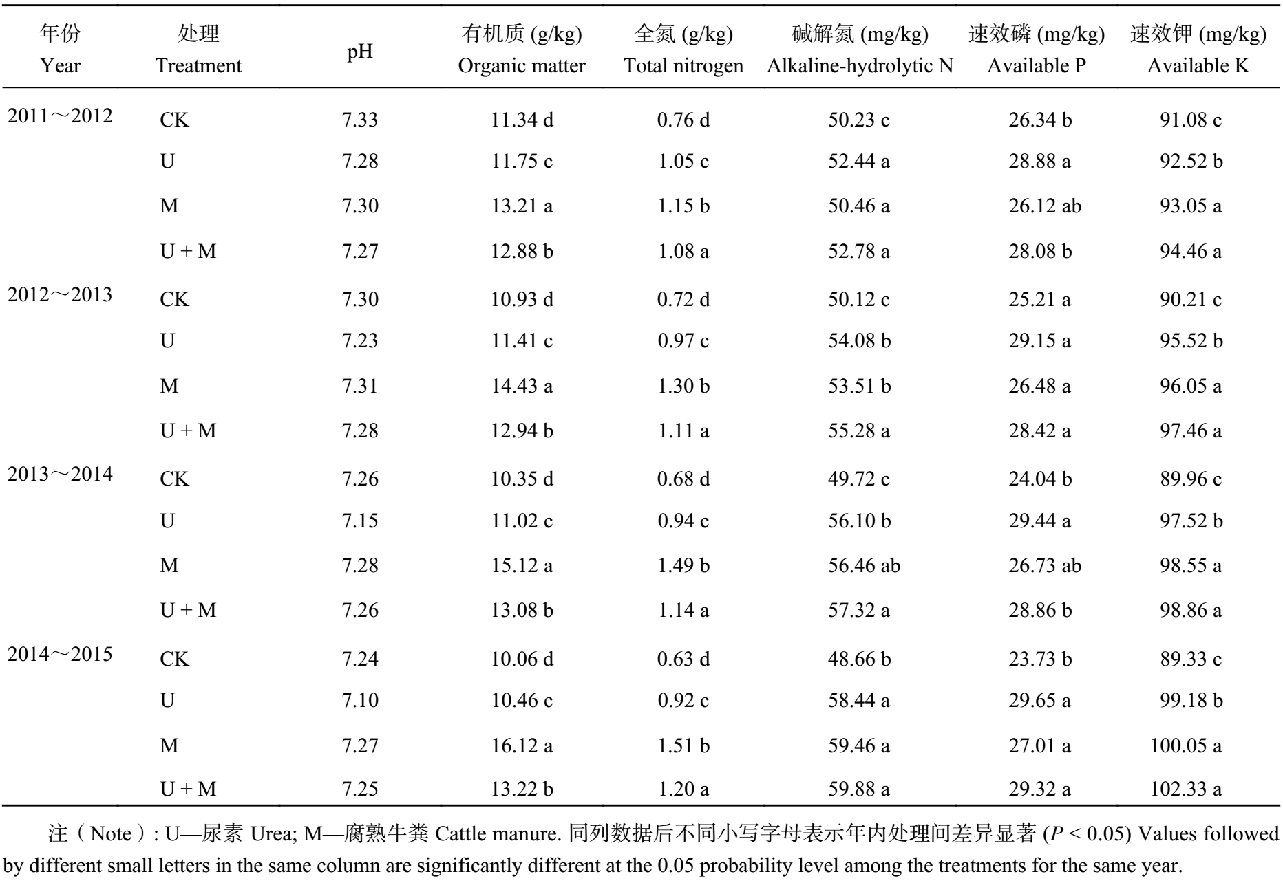 供试冬小麦品种为石麦 15 (SM15),种植密度为 240 × 10 4 株/hm2,每个小区种植 12 行,行距 20 cm。设置 4 个不同施肥方式:不施氮肥 (CK)、单施尿素 (U)、单施牛粪 (M) 和尿素牛粪 1∶1 配施 (U + M)。随机区组设计,每个处理设 3 次重复,共 12 个小区。氮肥类型为普通尿素和腐熟的牛粪,尿素中含氮量为 46.0%,过磷酸钙中 P2O5 含量 11.2%,硫酸钾中 K2O 含量为 51.1%,每年施入的有机肥料养分含量通过测定得出,具体见表 2。施氮处理的氮水平均为纯 N 180 kg/hm2。各处理的磷钾肥施用量保持相同,均为 P2O5 150 kg/hm2 和 K2O 150 kg/hm2。若牛粪处理不足 150 kg/hm2,则用过磷酸钙和硫酸钾补齐,若单施牛粪处理中的 P2O5 或 K2O 量超过 150 kg/hm2,则其他处理用过磷酸钙和硫酸钾补充至牛粪处理的量。2011~2015 年具体施肥量见表 3。牛粪 (湿基)、过磷酸钙、硫酸钾一次性基施,尿素分基肥和拔节追肥施用,基施和追施 1∶1。施肥方式为基肥播前撒施在地表,翻耕埋入土后播种并立即灌水;追肥在小麦拔节期开沟施用覆盖后灌水。2011~2014 年均于 10 月 10 日播种,田间管理同小麦高产田。
