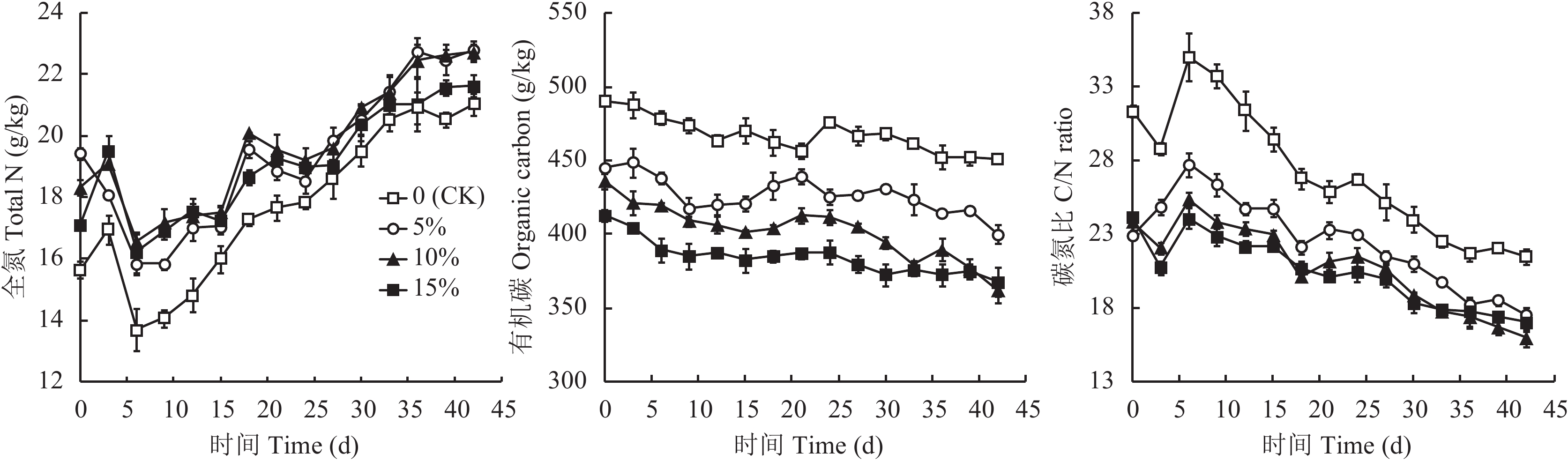 2.2 堆肥过程中全氮、有机碳和 C/N 变化堆肥过程中全氮含量变化总体呈现出先下降后上升的趋势 (图 3)。堆肥前期 (0~6 d) 猪粪中的氮被微生物分解转化为铵态氮并在高温条件下以 NH3 的形式挥发,导致堆肥中总氮含量的下降[15]并于第 6 d 达到最低;从第 6 d 开始随着堆肥中有机物质的分解和 NH3 挥发的减弱使堆肥中的氮得到“浓缩”,总氮含量不断增加。到第 42 d,各处理的全氮含量分别较堆肥初增加 34.2%、17.3%、24.0% 和 26.4%。