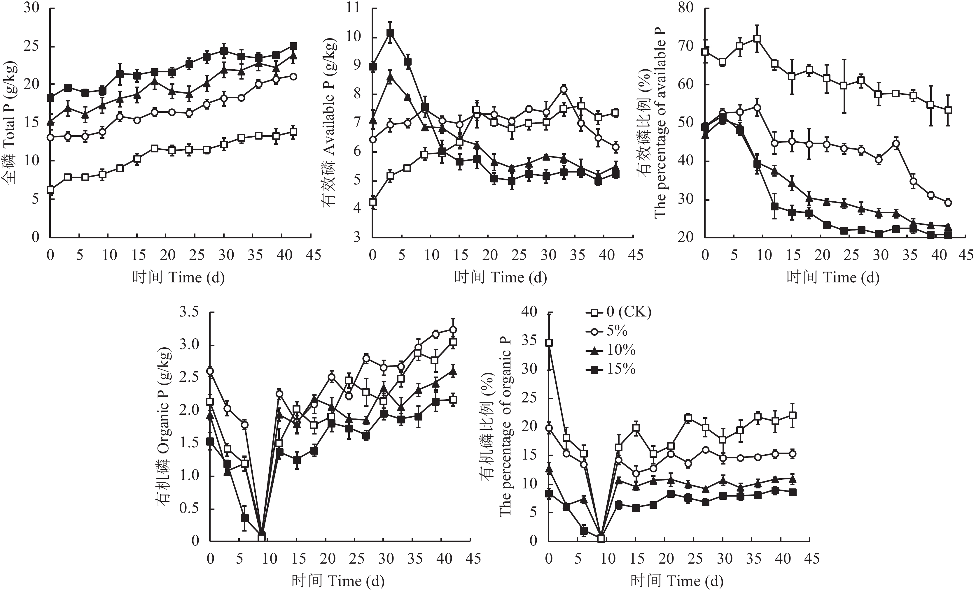 堆肥中有效磷含量的变化不同处理之间差异较大 (图 4)。CK 处理呈现持续增加的趋势,至 42 d 有效磷含量较堆肥初增加了 73.0%;5% 处理前 33 d 有效磷含量缓慢增加,随后持续下降,至 42 d 含量略低于堆肥初,降幅 4.0%;10% 和 15% 的处理变化规律较为一致,呈现出 0~3 d 升高,3~21 d 快速降低,从 21 d 开始基本趋于稳定,42 d 时有效磷含量降幅比较明显,分别较堆肥初下降了 23.2% 和 41.8%。