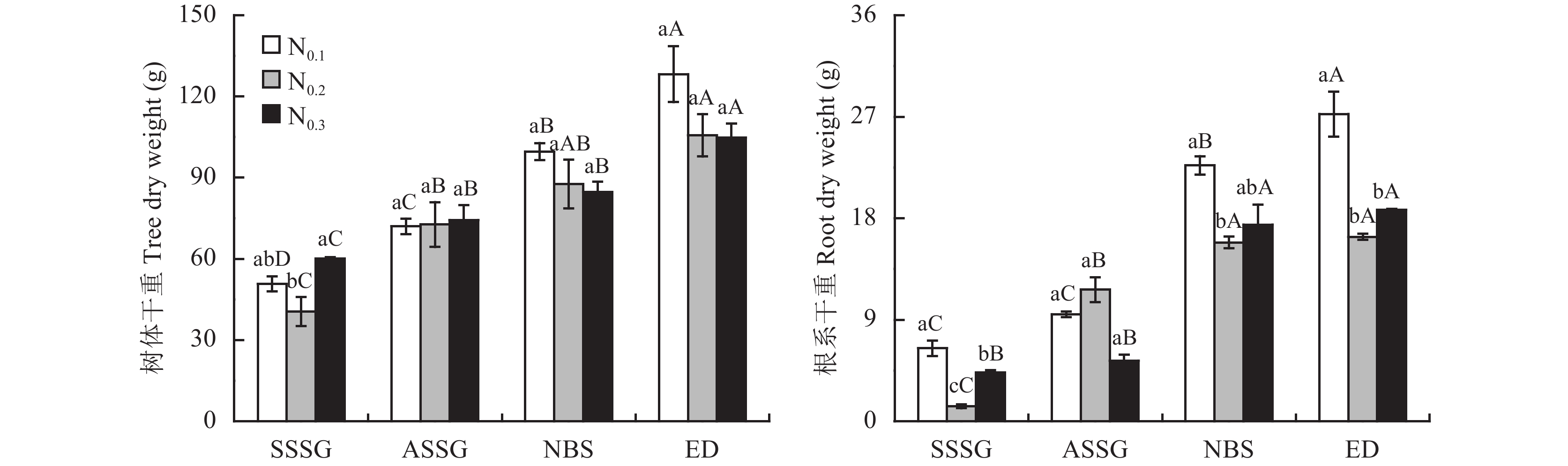 | 图1 不同生育期施氮水平对树体生长的影响 Fig. 1 Effects of different N rates on growth of apple tree at different growth stages [注(Note):SSSG—春梢停长期Spring shoot stop growing; ASSG—秋梢停长期Autumn shoot stop growing; NBS—养分回流期Nutrient backflow stage; ED—落叶前期Early defoliation stage; 柱上不同大写字母表示同一氮水平不同生长期间差异显著,不同小写字母表示同一生长期不同氮水平间差异显著 (P<0.05) Different capital letters mean significant differences among the growth stages at the same N rate, and different small letters mean significant differences among the N rates at the same growth stage (P<0.05).] |