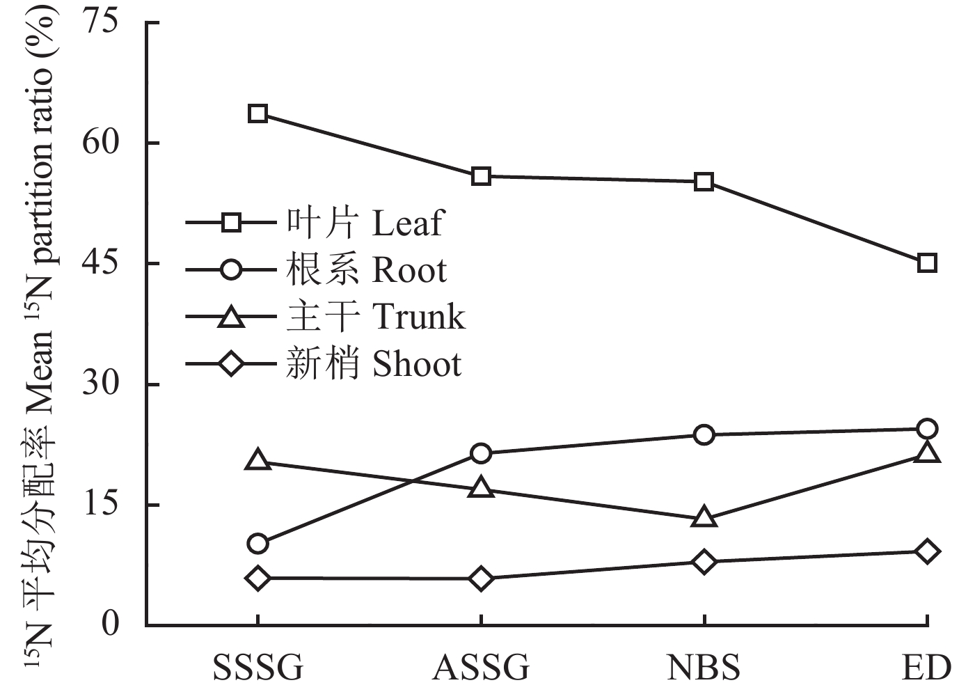 | 图2 不同生长期15N在苹果幼树各器官平均分配率 Fig. 2 The mean 15N partition rates in different organs of apple tree [注(Note):SSSG—春梢停长期Spring shoot stop growing; ASSG—秋梢停长期Autumn shoot stop growing; NBS—养分回流期Nutrient backflow stage; ED—落叶前期Early defoliation stage.] |