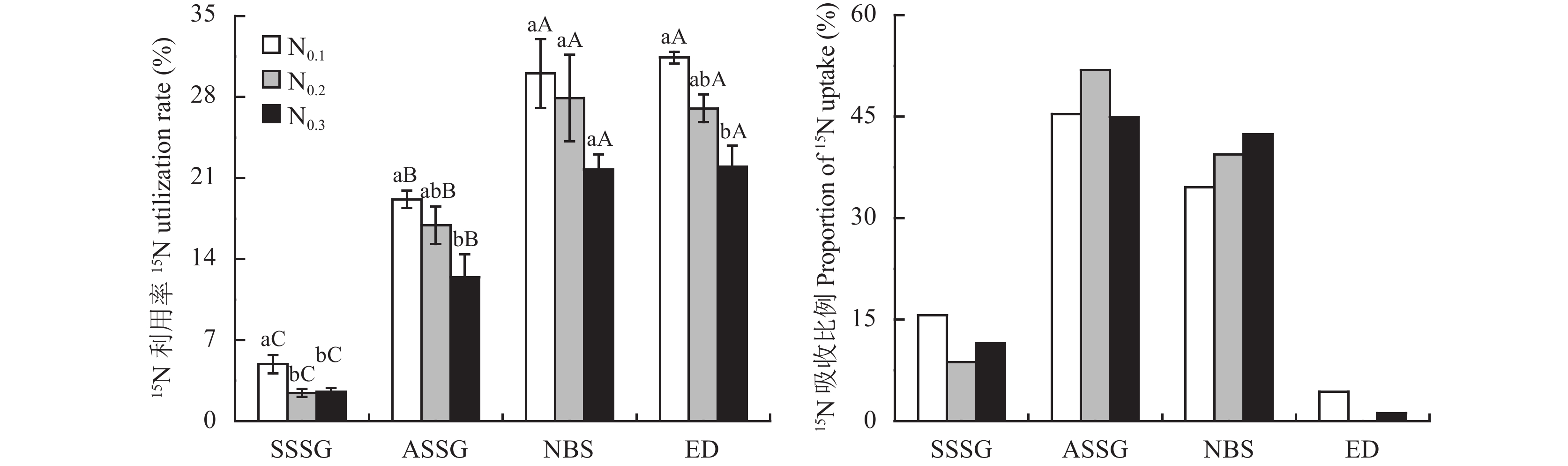 | 图3 施氮水平对不同生长期15N利用率及吸收比例的影响 Fig. 3 Effects of different N rates on 15N utilization rate and proportion of 15N uptake by apple tree at different growth stages [注(Note):SSSG—春梢停长期Spring shoot stop growing; ASSG—秋梢停长期Autumn shoot stop growing; NBS—养分回流期Nutrient backflow stage; ED—落叶前期Early defoliation stage; 柱上不同大写字母表示同一氮水平不同生长期间差异显著,不同小写字母表示同一生长期不同氮水平间差异显著 (P<0.05) Different capital letters mean significant differences among the growth stages at the same N rate, and different small letters mean significant differences among the N rates at the same growth stage (P<0.05).] |