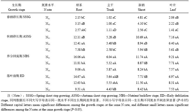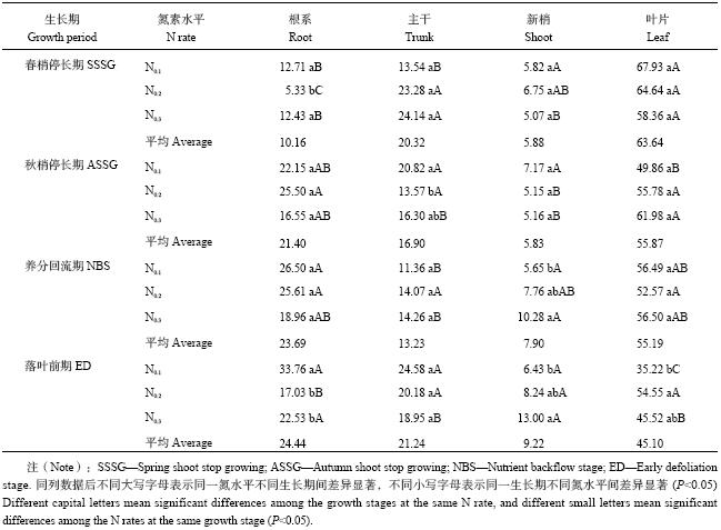 春梢停长期,果树新生器官 (叶片、新梢)15N分配率由高到低为N0.1 > N 0.2 > N 0.3,主干15N分配率由高到低为N0.3 > N 0.2 > N 0.1,N0.1处理主干15N分配率分别为N0.2和N0.3处理的58.2%和56.1%,表明在N0.1条件下树体新吸收的氮素可更为迅速地转运至地上部,用于新生器官的建造。秋梢停长期,各施氮水平根系15N分配比例增大,N0.1主干15N分配率显著增加,其叶片15N分配率和N0.2、N0.3主干分配率均降低,说明至秋梢停长期,根系是较强的生长中心,树体吸收的氮素优先分配于根系,且N0.1处理树体叶片和N0.2、N0.3处理树体主干中的部分氮素也向根系转运。