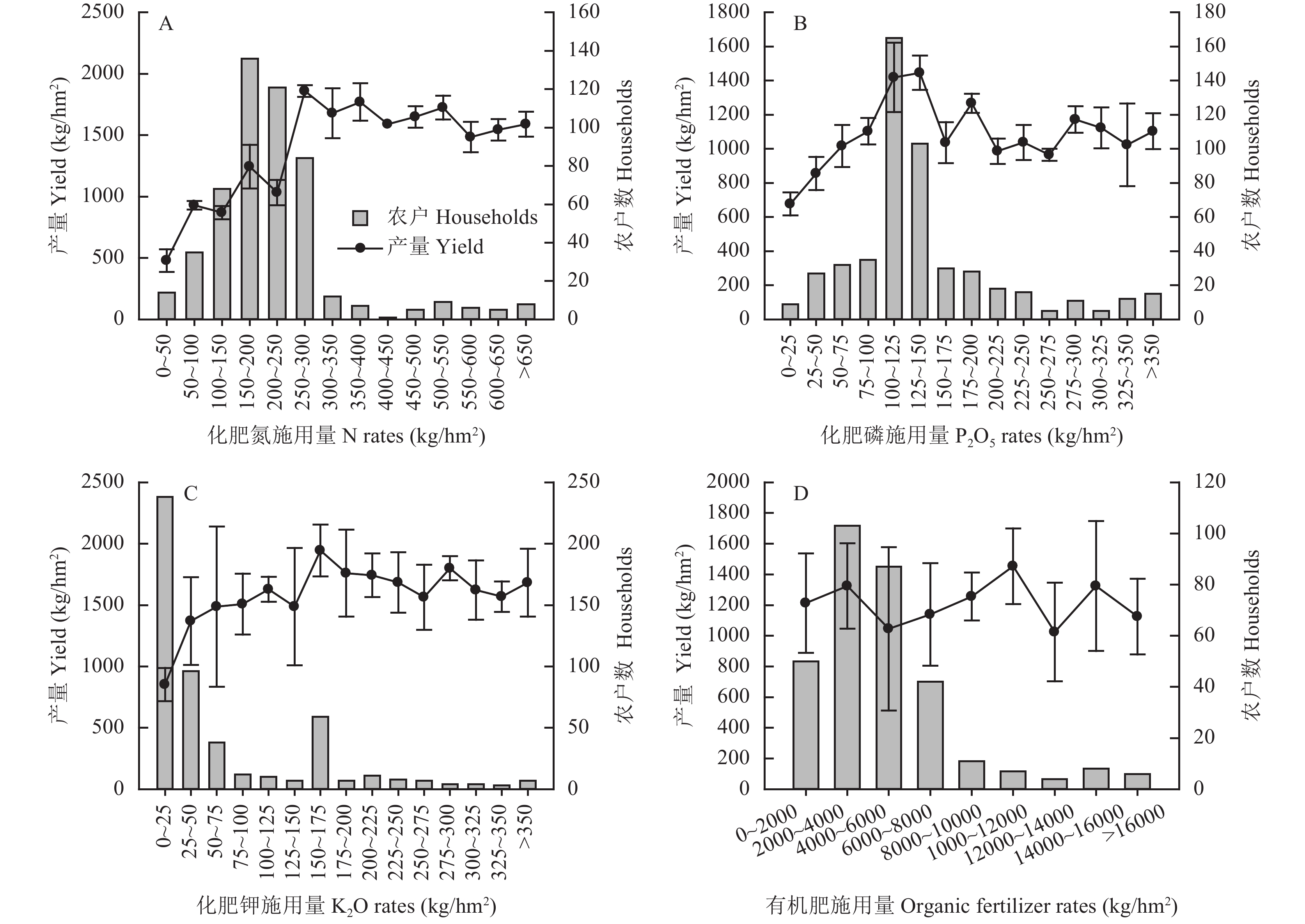图3 陕西商洛核桃产区不同肥料投入水平下的农户数和产量 Fig. 3 Walnut yield and household number under different nutrient input levels in the investigated orchards in Shangluo Region |