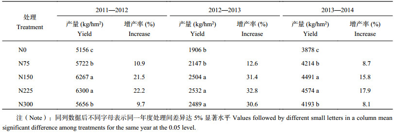 2 结果与分析 2.1 不同氮肥用量对冬小麦产量的影响2011—2014年3年冬小麦平均产量分别为5820、2316和4270 kg/hm2(表1),不同降水年型冬小麦产量差异较大,总体呈现出丰水年 (2011—2012年) 冬小麦产量 > 平水年 (2013—2014年) > 欠水年 (2012—2013年)。3年试验结果表明,产量均随施氮量呈先增加后降低的趋势,当施氮量达到150 kg/hm 2时,继续增施氮肥并没有显著提升小麦产量,而当施氮量超过225 kg/hm2时,继续施氮肥则会出现减产的现象。对3年产量进行回归分析可知 (n = 20),冬小麦产量与氮肥用量之间呈现显著抛物线关系 (P < 0. 05),由两者的回归方程 (2011—2012年,y = −0.0372x 2 + 13.274x + 5085.7,r = 0.9509;2012—2013年,y = −0.0114 x2 + 5.482x + 1877.3,r = 0.9658;2013—2014年,y = −0.0207x2 + 7.5279x + 3839.4,r = 0.9452,其中y为当季产量,x为施氮量) 计算可得,三年氮肥用量分别为178、240、182 kg/hm2时,产量即可达到最高值6269、2525、4523 kg/hm2,由此可见,合理的氮肥用量是小麦获得高产的重要措施。与对照相比,各施肥处理在丰水年增产10.9%、21.5%、22.2%和9.7%,在欠水年增产12.6%、31.4%、32.8%和30.6%,在平水年为8.7%、15.8%、17.9%和8.1%,N150处理3年均获得相对较高的增产率,继续增施氮肥增产率有降低的趋势,尤其是在丰水年和平水年N300处理的增产率更是低于N75处理。