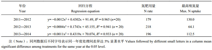 | 表3 三年试验冬小麦理论最高吸氮量与氮肥用量 (kg/hm2) Table 3 Maximum winter wheat N uptake and nitrogen fertilizer in the three tested years |