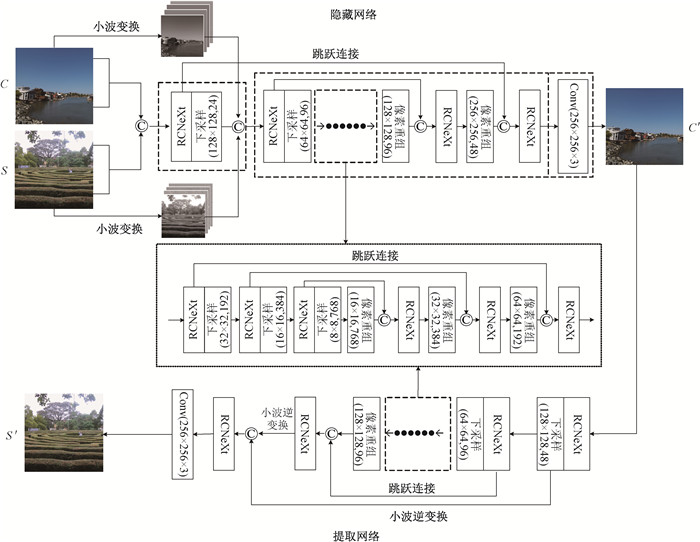 2 图像隐写方案DFNet 2.1 网络方案概述图像隐写方案DFNet的框架如图 1所示。其中,C表示载体图像,S表示秘密图像,C′表示载密图像,S′表示恢复的秘密图像,©表示跳跃连接。该方案采用了一种新型的双域融合方式,将图像的频域信息与图像的空间域信息相融合。网络结构设计为端到端的训练方式,其中隐藏网络和提取网络同步进行训练,且均采用编码-解码的方式。在网络结构中使用RCNeXt模块进行图像特征提取,并采用像素重组技术对图像特征进行解码,图 1的中间部分为隐藏网络和提取网络的共用部分。最后,通过跳跃连接使编码-解码通道的特征进行交互,获取更丰富的图像特征,从而有效提高网络的学习能力。
