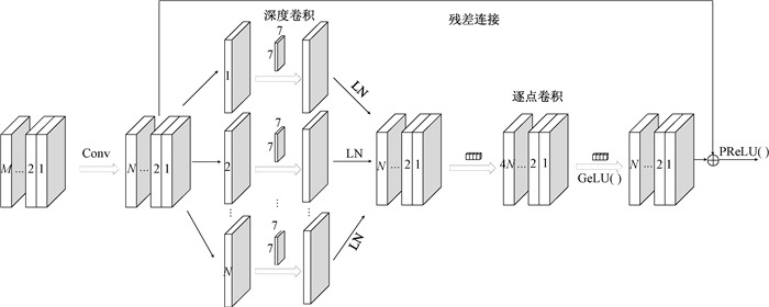 1.2 ConvNeXt Block随着新型网络架构Transformer[16]、Swin Transformer[17]等的出现,它们逐渐取代了传统卷积神经网络。Liu等[5]认为新型网络架构并不能完全取代卷积神经网络在图像处理中的应用,同时也认为传统卷积存在一些不足,因此提出了一种新的卷积神经网络模块ConvNeXt Block。该模块借鉴了Swin Transformer Block的设计理念和ResNet Block的实现方式,结合深度卷积和逐点卷积对图像数据进行特征提取,从而提升对数据的表达能力。