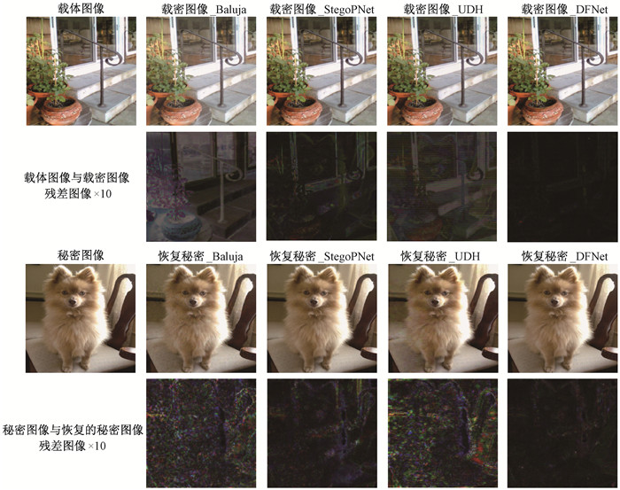 残差图像可以直观地显示出图像之间的视觉差距,通过载密图像是否与载体图像一致可以看出是否携带秘密图像信息。如果残差图像中包含隐藏的秘密信息,则会显示出图像之间的残差影像,即该方案不安全;如果在残差图像中看不到任何信息,则表明图像具有较好的不可感知性。不可感知性对比实验结果如图 3所示,对比了Baluja[22]提出的方案、Duan等[21]提出的StegoPNet方案、Zhang等[7]提出UDH方案,以及本文所提出的DFNet方案。可以看出,DFNet方案的载体图像与载密图像的10倍残差图像依旧没有表现出明显的像素差异,无法区分是否携带秘密信息,因此具有较好的不可感知性。