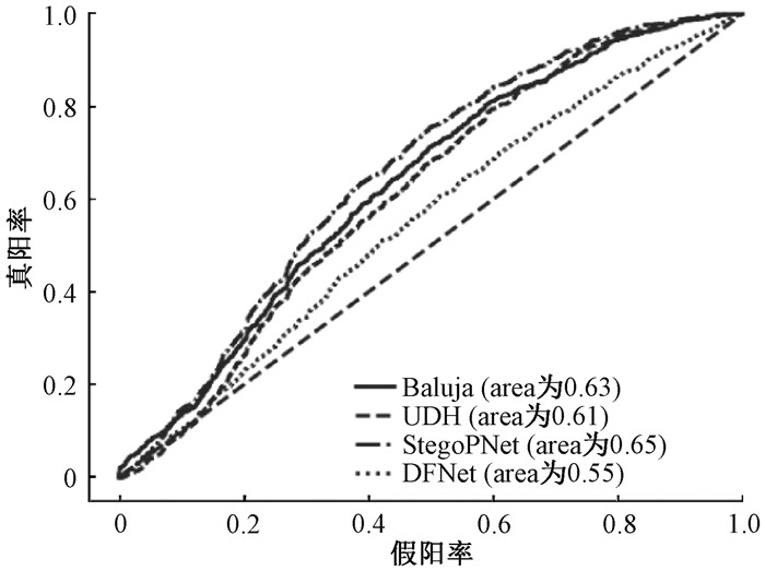 3.5 安全性分析图像隐写的安全性可通过隐写分析器来评估。为了检验DFNet方案的抗隐写分析性能,采用StegExpose[24]对1 500张载体图像和1 500张载密图像进行隐写分析测试,并将结果绘制成ROC曲线,如图 5所示,其中对角虚线表示随机猜测。若测试结果越接近对角虚线,则表明该方案的抗隐写分析能力越强。将DFNet方案与其他隐写方案在ROC曲线上进行了对比,结果表明,DFNet方案更接近对角虚线,因此具有更高的安全性。