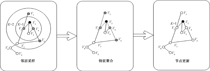 2 背景知识 2.1 GraphSAGE网络传统的图卷积神经网络在训练时需要用到整个图的邻接矩阵,依赖于具体的图结构,一般只能用于直推式学习。为了解决这个问题,Hamilton等[23]提出了GraphSAGE。GraphSAGE是一种GNN模型,旨在学习图中节点的低维表示,其核心思想是通过采样邻居节点并将它们聚合起来生成节点表示。这种采样和聚合的方式使得GraphSAGE能够扩展到大规模图,并且对每个节点都可以在固定数量的步骤内生成表示。GraphSAGE算法流程如图 1所示。