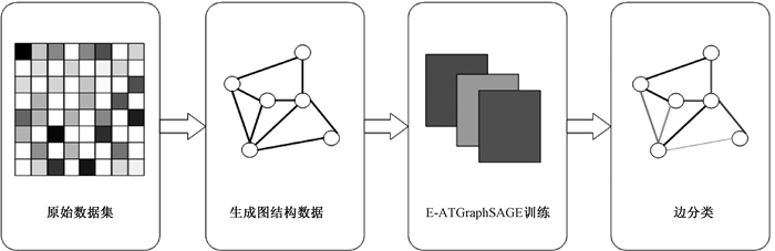 本文提出的网络攻击检测框架利用E-ATGraphSAGE算法进行网络攻击检测,具体包括3个步骤:数据预处理; E-ATGraphSAGE数据嵌入; 边分类。基于E-ATGraphSAGE的网络攻击检测流程如图 2所示。