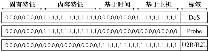 数据集中流量样本的特征分为固有特征、内容特征、基于时间的特征和基于主机的特征[16]。基于上述弱相关的概念,本文分析了DoS、Probe、U2R和R2L四种恶意流量的弱相关特征,并分别设计了对应的掩模策略,其中U2R与R2L的弱相关特征一致,采用相同掩模,具体见图 1。在扰动生成后,首先将生成的对抗样本与相应的掩模进行按位“与”操作,再将修改后的扰动与原始样本进行叠加,仅调整弱相关特征的值,保证生成的对抗样本在逃避检测的同时具有可执行性和攻击性。