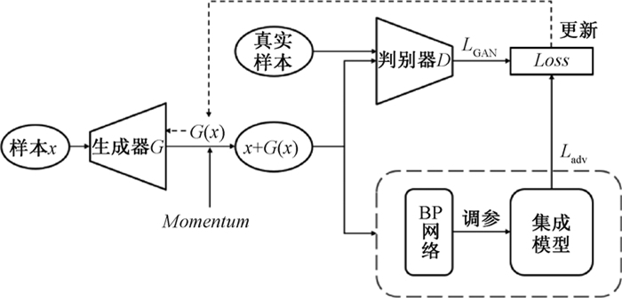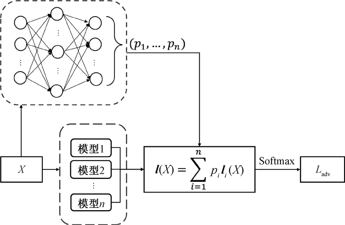 式中:M(x)表示模型的输入;H表示数据集大小;Li为第i个模型得到的交叉熵损失。本文采用BP神经网络作为元学习定参网络,用于实现对某一对抗样本能自动生成对应的概率参数来更新集成模型中各模型权重。元学习网络在训练过程中通过最大化集成模型损失函数学习最佳的赋权方式,这个过程可以视为对抗性训练的一种形式,旨在增强集成模型对对抗样本攻击的防御能力。模型总体结构如图 2所示。
