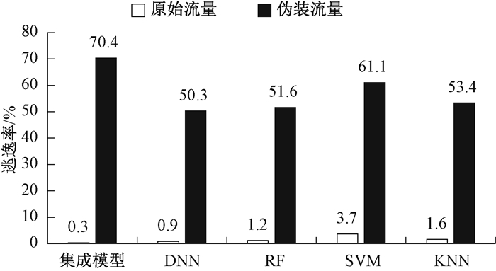逃逸率表示检测模型误将恶意流量识别成正常流量的概率,逃逸率数值越高说明对抗样本攻击能力越强,定义为