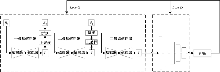 多尺度编解码深度卷积神经网络整体结构如图 5所示。每一级都是由编码器(encoder)和解码器(decoder)两个部分共同组成,从较小尺度开始逐步细化输出,网络的输入B3、B2和B1分别为64×64、128×128、256×256分辨率的模糊图像,每层的输出I3、I2和I1的分辨率也分别对应为64×64、128×128、256×256。在训练过程中,上一层网络的输出进行2倍上采样,并和下层分辨率相同的模糊图像共同作为下层网络的输入,在不同尺度上的详细定义可以表示为