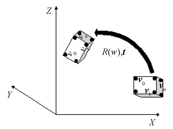 1 基于EPnP算法的跟踪定位跟踪定位技术就是在现实世界中的人体关键骨骼部位固定定位器,持续跟踪记录定位器的空间坐标信息,达到捕获人体关键骨骼部位的位置与姿势的目的[6].在沉浸式虚拟环境中,跟踪定位是实现沉浸感和交互的关键,为实现维修动作的虚拟耦合提供坐标数据.跟踪定位过程如图 1所示,在需要跟踪定位的物体表面固定n个特征点(ν0, ν1, …,νn).当物体在空间中运动时,用[R(w), t]表示其运动过程,w表示角度的变化,t表示位移的变化.