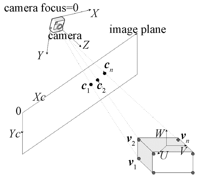 在虚拟维修过程中,维修人员的交互动作会使特征点之间的相对位置产生变化,因此PnP求解得到的结果稳定性差,易收到噪声.本文采用PnP的改进型算法EPnP来计算虚拟维修人员的位姿信息[6]. PnP问题是指,在虚拟环境中,假设被跟踪的人体关键骨骼部位有n个特征点(ν0, ν1, …,νn),并已知它们的相对位置信息,n个特征点在透视平面中的投影点为(c1, c2, …, cn),从投影点求解物体相对于相机的位置和姿态信息[7],如图 2所示.这样,当我们分别求得多个不同拍摄时刻下物体相对于相机的位置和姿态,就可以求出这段时间内物体相对于相机的平移和旋转.