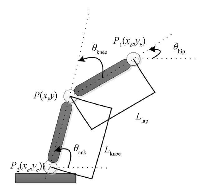 | $ {\left( {{x_b} - x} \right)^2} + {\left( {{y_b} - y} \right)^2} = L_{{\rm{lap}}}^2, {\left( {{x_c} - x} \right)^2} + {\left( {{y_c} - y} \right)^2} = L_{{\rm{calf}}}^2. $ |