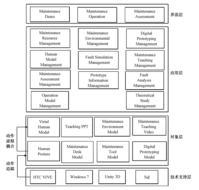 3 原型系统实现与测试原型系统以某雷达设备为例,研究并构建该设备的沉浸虚拟维修训练环境,通过耦合HTC VIVE硬件设备,实现沉浸式虚拟维修能力.原型系统框架如图 5所示.系统基于Unity 3D引擎开发,语言为C#,平台为64位Windows 7操作系统,支撑设备为HTC VIVE,数据库为Sql.运行效果图如图 6所示.通过实际操作,系统运行良好.虚拟维修人员进行故障维修时,能对维修人员的动作实时定位追踪,并且维修人员与虚拟人体模型动作保持一致,基本实现了沉浸式虚拟维修要求.