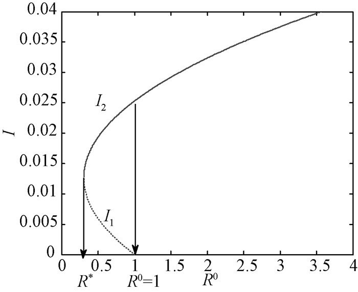4) 当B < 0, 若R0 < R0* < 1时,系统(2) 没有地方病平衡点; 若B < 0, R0*≤R0 < 1时,系统(2) 有两个地方病平衡点P1, P2, 其中R0=R0*时P1=P2.