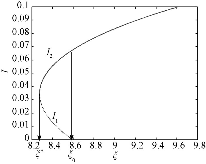 本文经过研究发现系统在R0=1处会出现后向分支, 且后向分支的出现会使系统可能出现双稳性.若取ξ为分支参数,则当a1>0, a2>0时出现后向分支; 当a1 < 0, a2>0时出现前向分支.又因为∂a1/∂ξ>0, 所以系统出现后向分支的可能性随着ξ的增加而增加.还得到当R0 < R0* < 1时, 传染病会逐渐消失, 否则传染病会一直存在, 所以我们要采取一切措施减小基本再生数, 通过分析可知增大ξ与m′的值可以减小基本再生数.