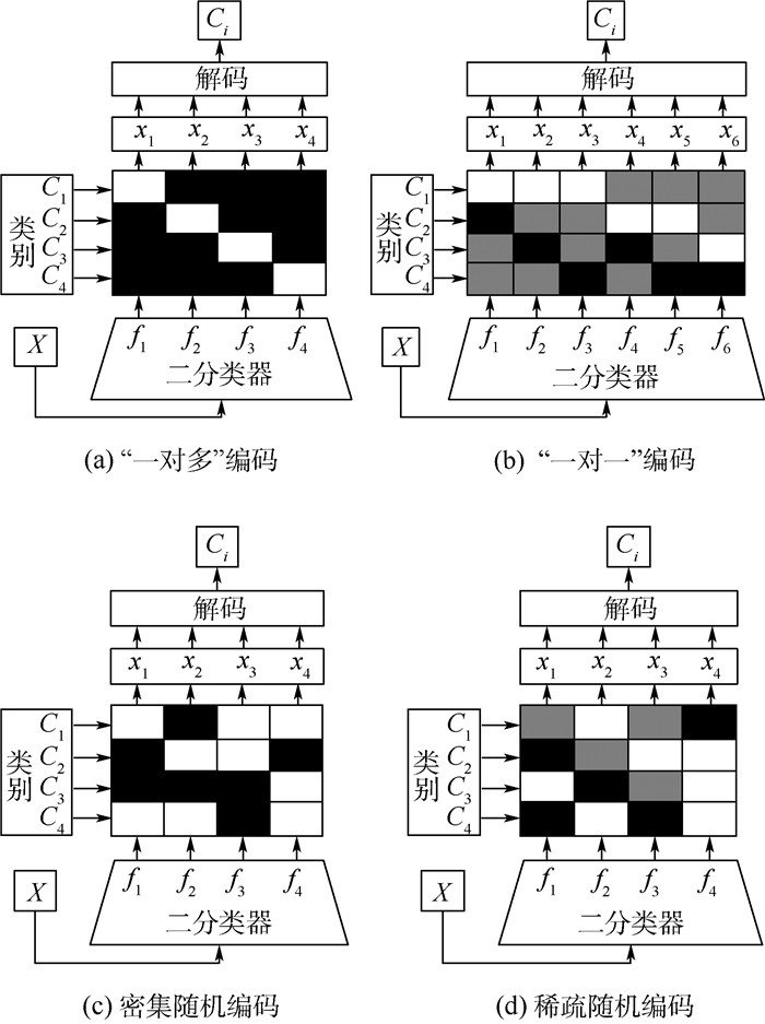 1 纠错输出编码ECOC是一种利用二元或三元的编码矩阵将多类分类问题分解为若干个二类分类问题的通用集成框架。其中,二元编码矩阵可以表示为M∈{-1, +1}k×S,k为类别数,S为编码长度,编码矩阵的行代表某一类,编码矩阵的列代表一个二类划分,“-1”表示其所在行对应的类在二类划分中被划分为负类,“+1”表示其所在行对应的类在二类划分中被划分为正类;三元编码矩阵可以表示为M∈{-1, 0, +1}k×S,其中“0”表示其所在行对应的类在二类划分中被忽略。图 1给出了4种常见的ECOC编码方法,分别是:“一对多”编码、“一对一”编码、密集随机编码、稀疏随机编码。图 1中码元“+1”、“-1”和“0”分别用白色、黑色和灰色表示。