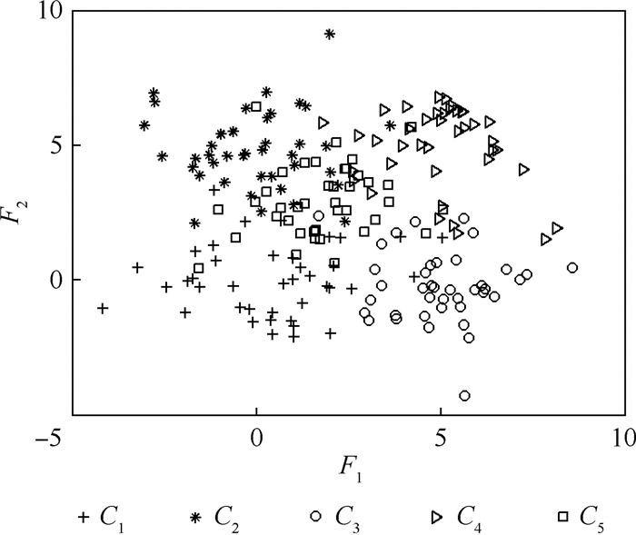 3.1 实验数据实验数据为一个人工数据集和多个UCI数据集[19]。人工数据集共包含5类样本,每一类的样本个数为50,各类的数据分布如图 2所示。每一类特征向量的维数为2,图中分别用F1和F2表示,并且服从正态分布,其概率密度函数为