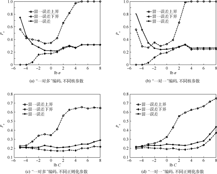 3.3 实验结果与分析 3.3.1 人工数据集图 3分别给出了不同核参数和正则化参数下的留一误差和留一误差上下界的变化情况,分类错误率为Pe。由图 3可以看出,留一误差随着这2个参数的变化起伏较大,这证明了通过对正则化参数和核参数进行优化,可以有效地提高ECOC的泛化性能。对比图 3(a)、(b)和图 3(c)、(d)中留一误差变化曲线的起伏程度可知,核参数对ECOC的留一误差的影响要大于正则化参数的影响。这说明,对核参数进行优化对于提高ECOC的泛化性能更加重要。