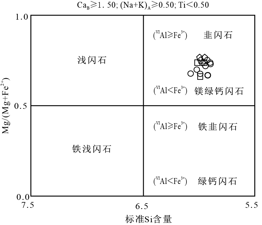 图 4 鸡冠山堆积岩中角闪石分类图(底图据Leake et al.,1997,2004;图例同图 3) Fig. 4 Classification of hornblendes in the Jiguanshan cumulate(modified after Leake et al.,1997,2004) |