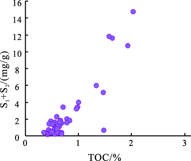 图 5 塔西南坳陷二叠系烃源岩TOC与S1+S2相关图 Fig. 5 Diagram showing the relationship between TOC and S1+S2 of the Permian hydrocarbon source rocks in the southwest depression of Tarim Basin |