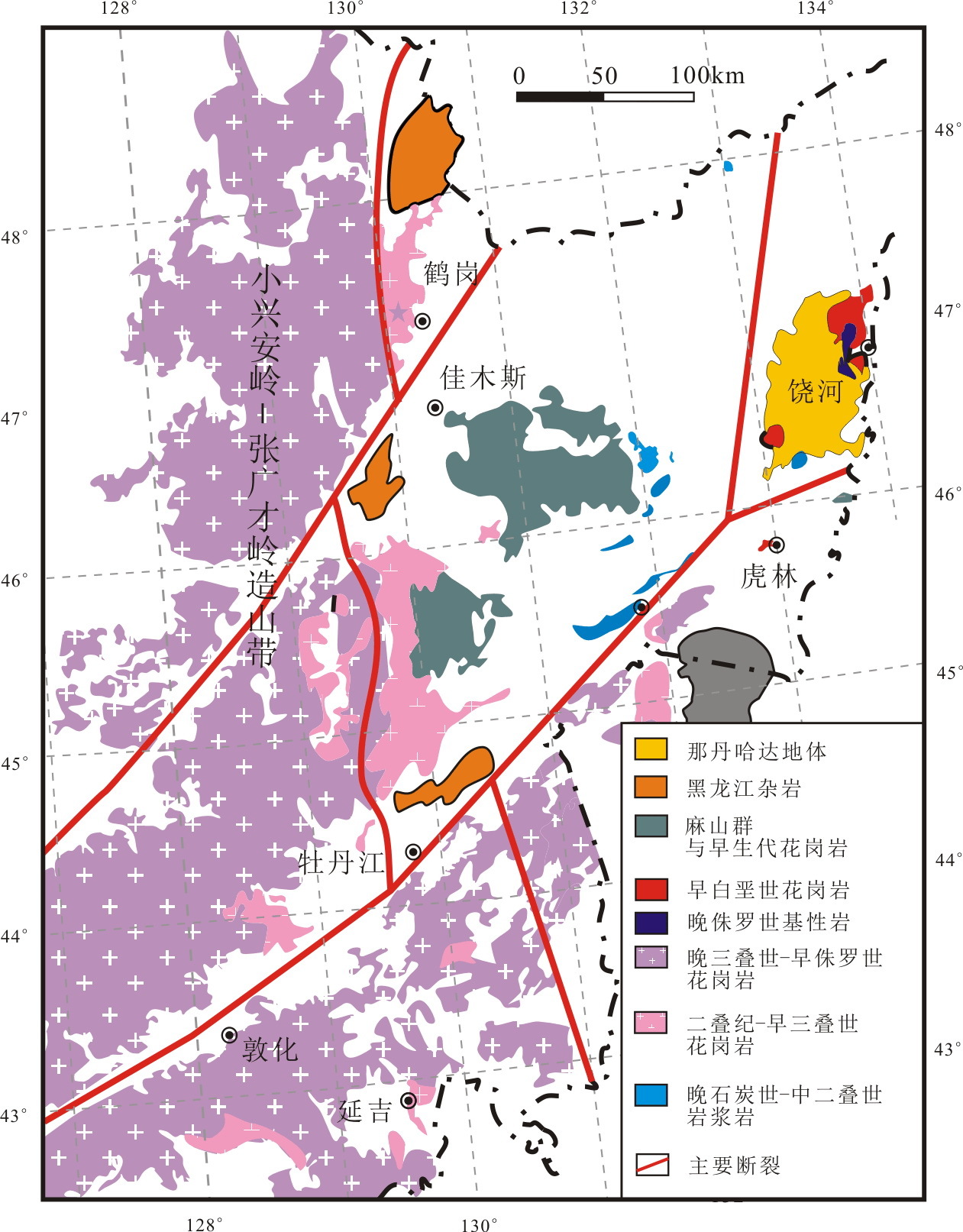 1 区域地质概况 1.1 小兴安岭-张广才岭造山带小兴安岭-张广才岭造山带位于松辽地块东缘,近南北走向,东侧为牡丹江断裂。该造山带由大量花岗岩类、少量晚古生代变质沉积岩和伴生的中生代火山岩组成(图 3)。