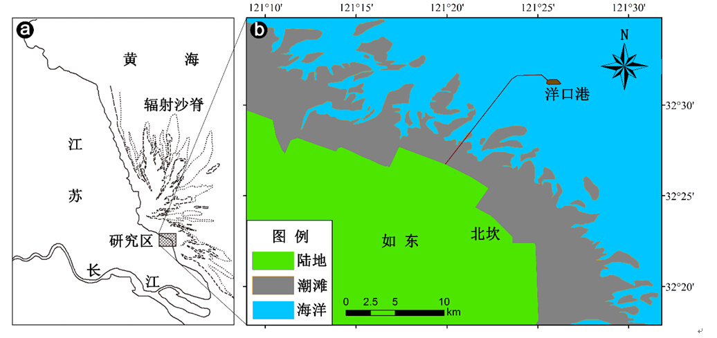 如东海岸位于江苏省东南部、南黄海辐射沙脊群南翼,受倚岸型潮流沙脊的掩蔽作用,发育了半封闭的平原型粉砂淤泥质潮滩(图 1)。以北坎为界,南侧岸线为南北走向,北侧岸线走向为SEE—NWW。岸线基本稳定,淤长速率小,潮滩自陆向海由盐沼—互花米草滩、泥沙混合滩与砂滩三个带组成[27]。受大面积围垦活动的影响,潮间带宽度由5~11 km缩减为5~8 km。潮滩坡度较缓,为0.5‰~1.2‰[28]。沉积物以砂质粉砂和粉砂质砂为主,平均粒径为3.0~5.8